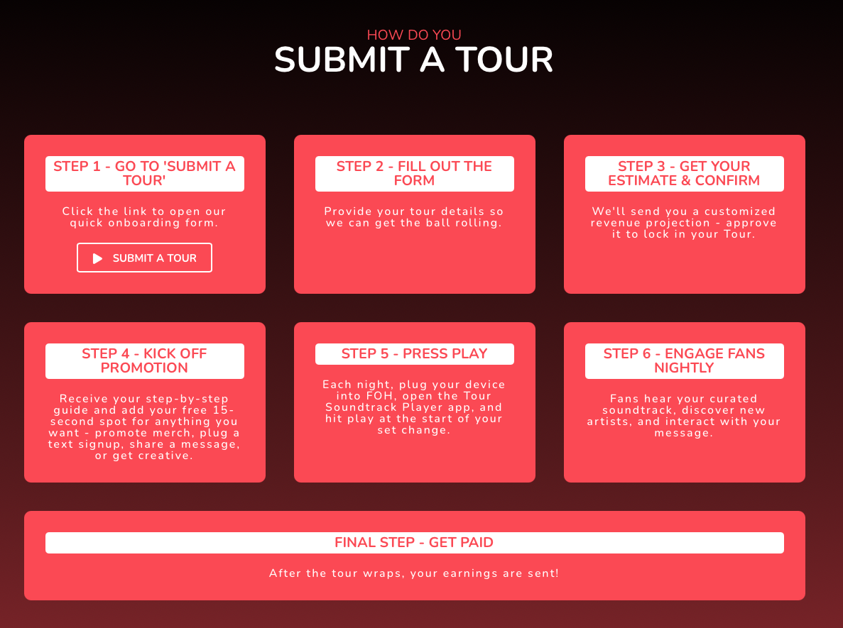 Der Ablauf für Bands, die einen Song einbuchen wollen, läuft laut Website in fünf Schritten ab: Tour auswählen, Track einreichen, Placement erhalten und am Ende die Auswertung verfolgen.